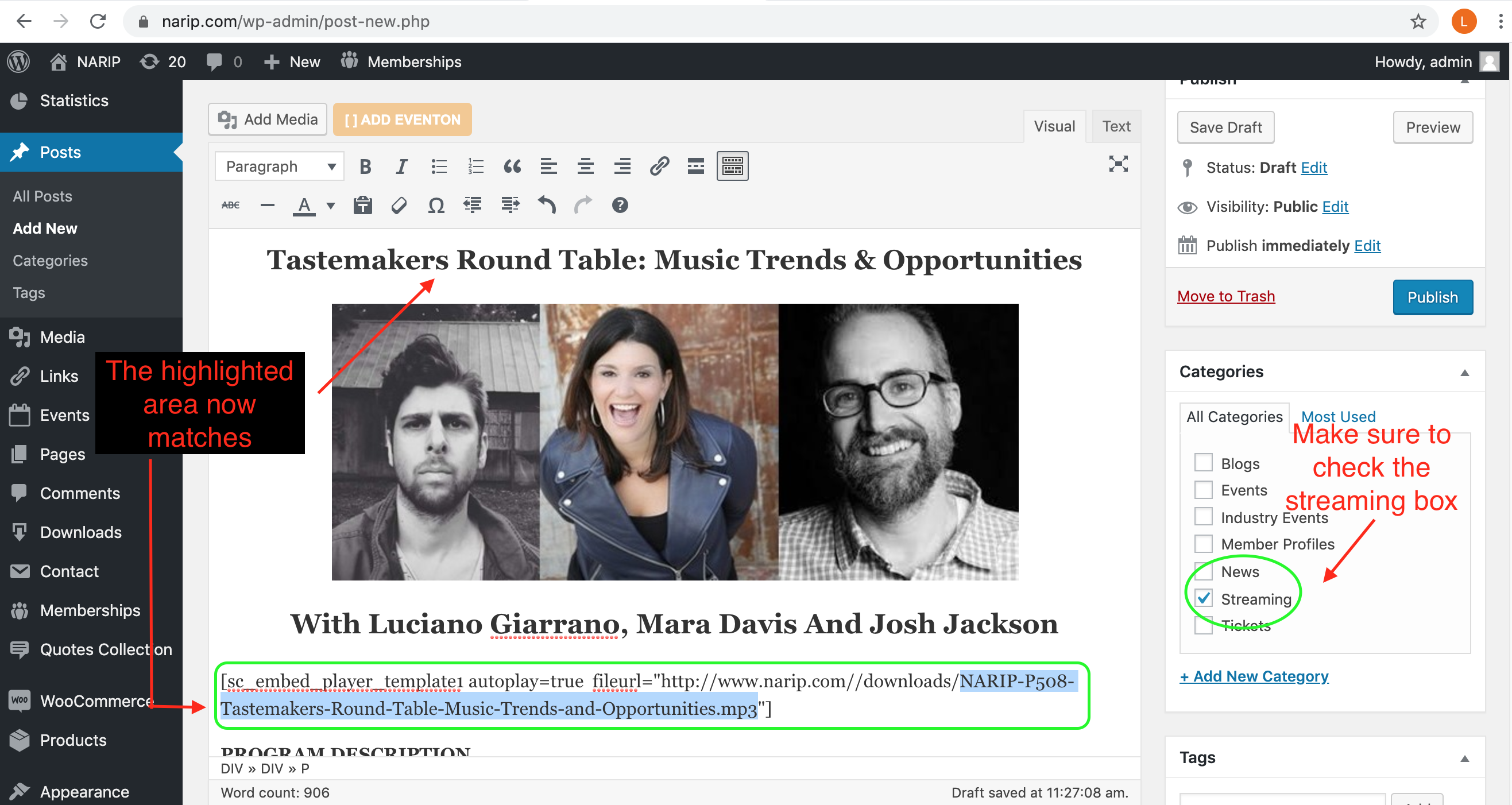 • write a short description of the program. you can usually copy and paste a sentence from the main text area. i.e. “This audio program is a recording of NARIP’s Taste Makers Round Table Panel with special guest speakers Immersive Atlanta’s Luciano Giarrano, Adult Swim’s Mara Davis, and Paste Magazine’s Josh Jackson.”