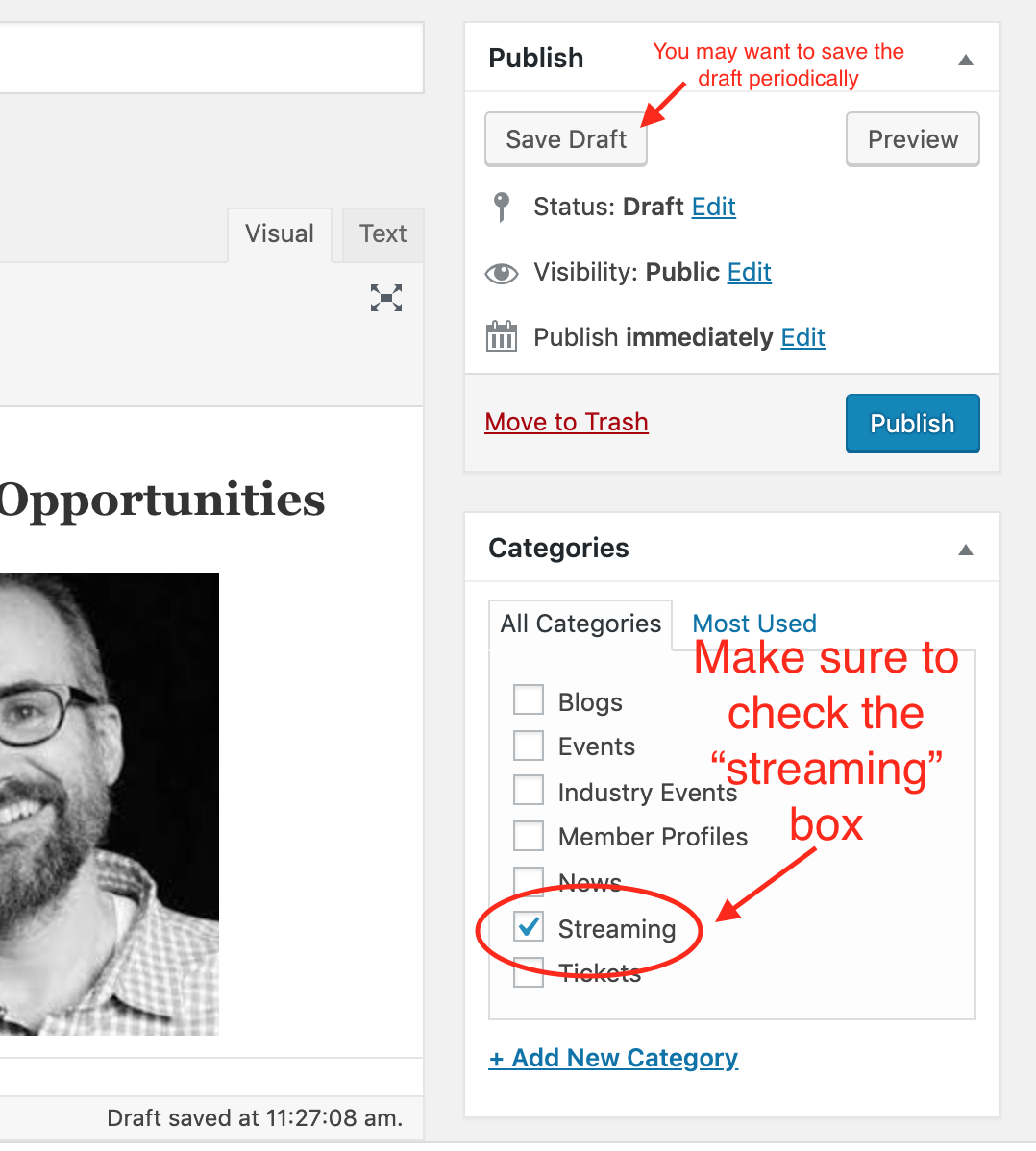 17. Then scroll back to the top to the Publish section, which is in the same right column above Categories section. Click on “Save Draft.